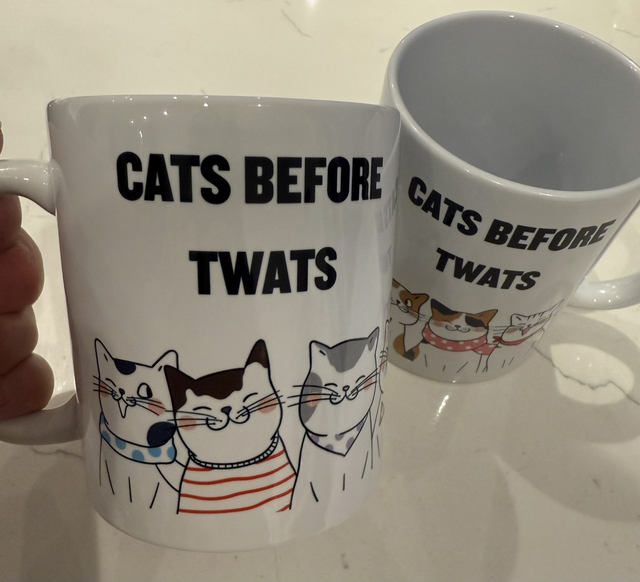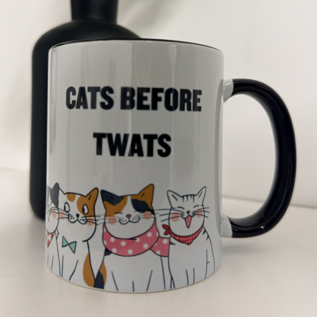 Make your morning coffee purr-fectly hilarious with this bold and cheeky “Cats Before Twats” mug – the ultimate coffee cup for unapologetic cat lovers with a sarcastic streak. Featuring a lineup of adorable cartoon cats in bow ties and bandanas, this funny cat mug is a sassy must-have for any cat mom who prioritizes her feline friends over foolish people.