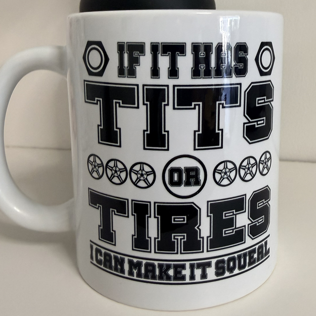 - This amusing novelty car mug makes an ideal present for the special man in your life, featuring the cheeky slogan "if it has tits or tires I can make it squeal." It's a fantastic choice for a Secret Santa gift or for celebrating Father's Day.
