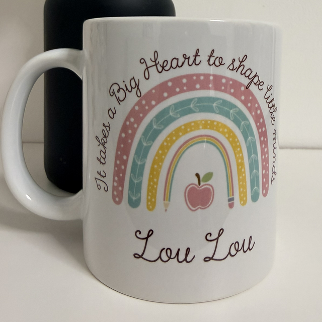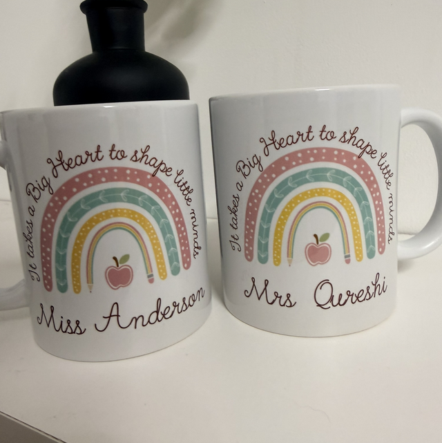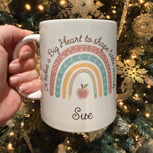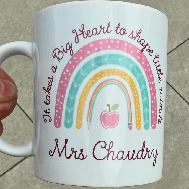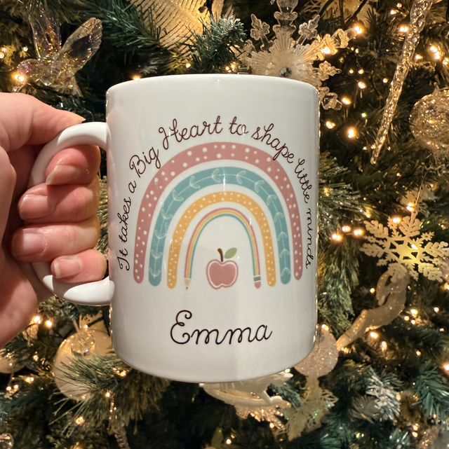 Celebrate your favorite teacher with this personalized rainbow mug, why not make it a set with a matching coaster, featuring the heartfelt phrase: “It takes a big heart to shape little minds.”
